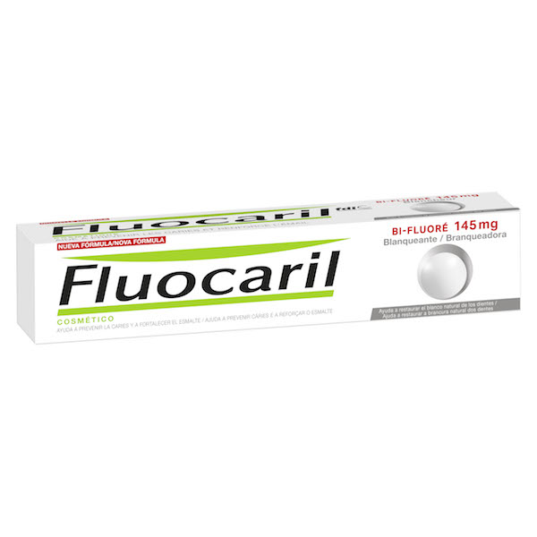 La pasta dentífrica Fluocaril Bi-Fluoré 145mg Blanqueante limpia para conseguir un blanco natural y ayuda a prevenir las caries. Especialmente diseñada para promover la eliminación de la placa dental y pulir el esmalte suavemente, la pasta de dientes Fluocaril 145mg Blanqueadora permite así reducir la apariencia de la coloración superficial del esmalte, y reforzar el resplandor y la blancura natural de su sonrisa. Su formulación bi-fluorada (fluoruro de sodio + monofluorofosfato) también ayuda a prevenir las caries y a reforzar el esmalte. Además de su eficacia blanqueadora de larga duración, la pasta de dientes blanqueadora Fluocaril 145mg limpia profundamente los dientes, elimina la placa y ayuda a prevenir las caries. El flúor también actúa en la prevención de los ataques de los ácidos evitando que las bacterias crezcan en la cavidad oral, incluso después del cepillado. La FDI Federación Dental Internacional reconoce que cepillarse los dientes dos veces al día con una pasta dental con flúor como Fluocaril 145mg Blanqueante ayuda a mantener una buena salud dental.