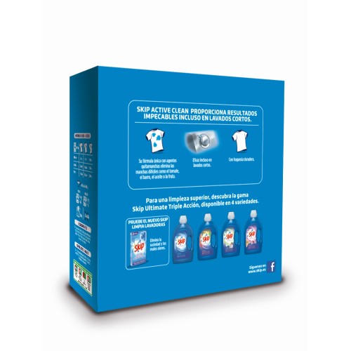 Una colada con sensación de recién lavado que dura por más tiempo. Gracias a su fórmula descubrirás una frescura y sensación de recién lavado que perdura hasta el siguiente lavado.Active Clean Todos los niños tienen el derecho de ser niños, el derecho a descubrir el mundo por ellos mismos y son libres de ensuciarse. Gracias a Skip, ya no tienes que preocuparte por las manchas.