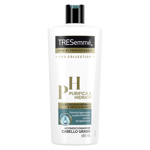 ¡Presentamos TRESemmé Purifica e Hidrata - una gama diseñada para limpiar y purificar profundamente el cabello graso, mientrasretiene la hidratación para mantenerlo hidratado y suave! Nuestra fórmula profesional combina Ácido Hialurónico, que ayuda a mantener la hidratación restaurando el escudo protector natural del cabello. Combinado con Arcilla Blanca de Caolín, un polvo natural, finamente triturado y de origen mineral utilizado en rituales de belleza desde hace miles de años, que ayuda a combatir la producción excesiva de grasa. Cuando se combinan con nuestro champú y exfoliante para el cabello TRESemmé Purifica e Hidrata, estos ingredientes funcionan al unísono para hidratar y purificar tu cabello. Nuestra gama ha sido formulada a un pH que permite la máxima eficacia y seguridad del producto sin alterar el pH natural del cabello.
