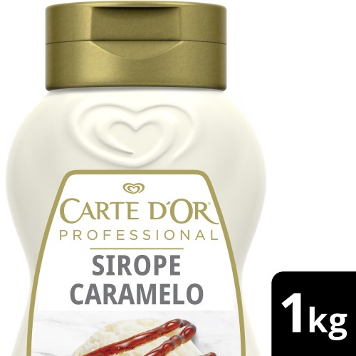 Sirope de caramelo Carte D'Or, perfecto para endulzar bebidas o para decorar helados y postres. Listo para usar, en botella de fácil manipulación con tapa anti-salpicadura.