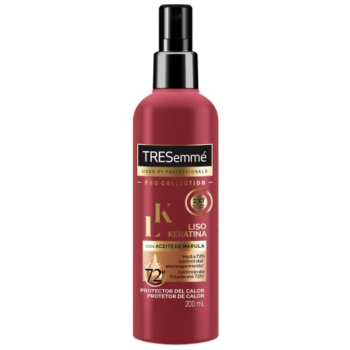 El protector del calor Liso Keratina, ayuda a crear una barrera contra el daño de secadores, alisadores o rizadores, protegiédolo hasta 230°C grados. Cómo se aplica 1. Lava y acondiciona el cabello con el champú y acondicionador Liso Keratina de TRESemmé. 2. Seca el cabello con una toalla y aplica sobre el pelo húmedo el spray protector del calor Liso Keratina.3. Para facilitar el alisado, seca el cabello completamente con un secador apuntando hacia abajo.