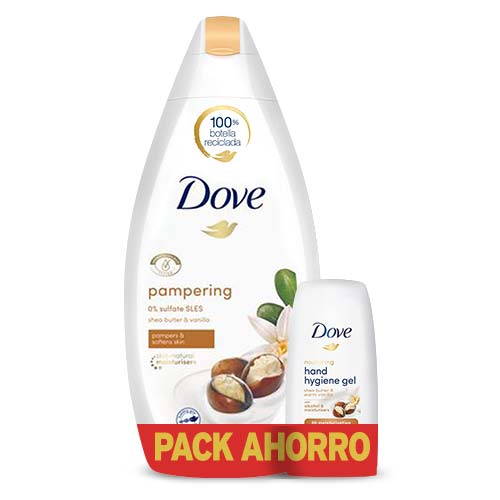 El gel de ducha Dove con karite y Vainilla llenará tu baño de una fragancia única que te dejará revitalizada y renovada. Su textura sensorial y cremosa te envolverá en un delicioso cuidado. Dove Cuidado sensorial deja tu piel suave y cuidada desde la primera ducha. Y con el gel hidroalcohólico combina hidratantes humectantes y oclusivos en una fórmula hidroalcohólica a base de alcohol para proporcionar una hidratación duradera de las manos de más de 8 horas. Nuestra fórmula ha demostrado que funciona en la piel, nutriéndola y manteniendo la hidratación. El gel hidroalcohólico de manos Dove Shea Butter ayuda a hidratar la piel seca sin sacrificar su eficacia.